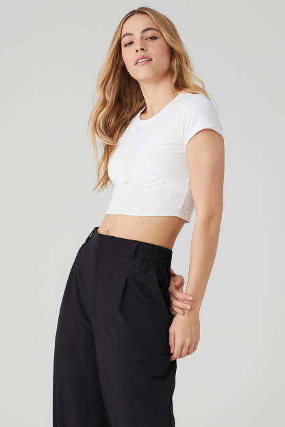 Strong in the studio, sweet on the street. The athelosoft Crop Finesse Short Sleeve has all the performance qualities you love, plus a baby tee silhouette and super-soft feel. It*s a yoga wardrobe staple.