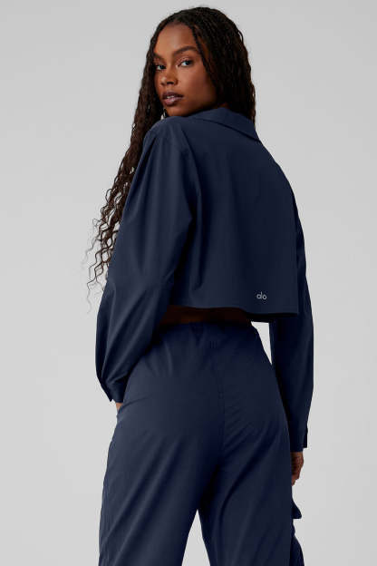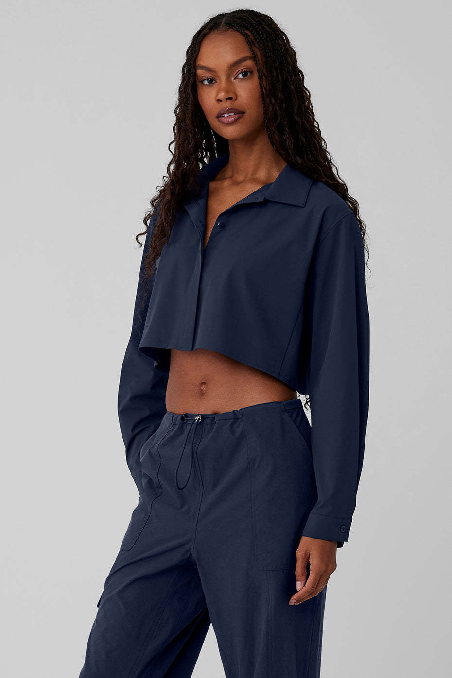 The wardrobe staple you*ll reach for again and again. It*s made from a drapey twill fabric with a little stretch, a classic collar and cuffs, hidden buttons and a cute cropped hem. Layer it over a bra top and leggings, wear it as a shirt with your favorite trousers〞you know what to do.
