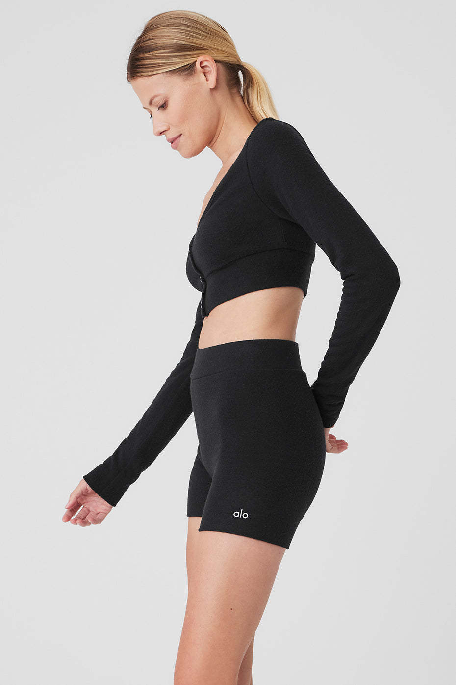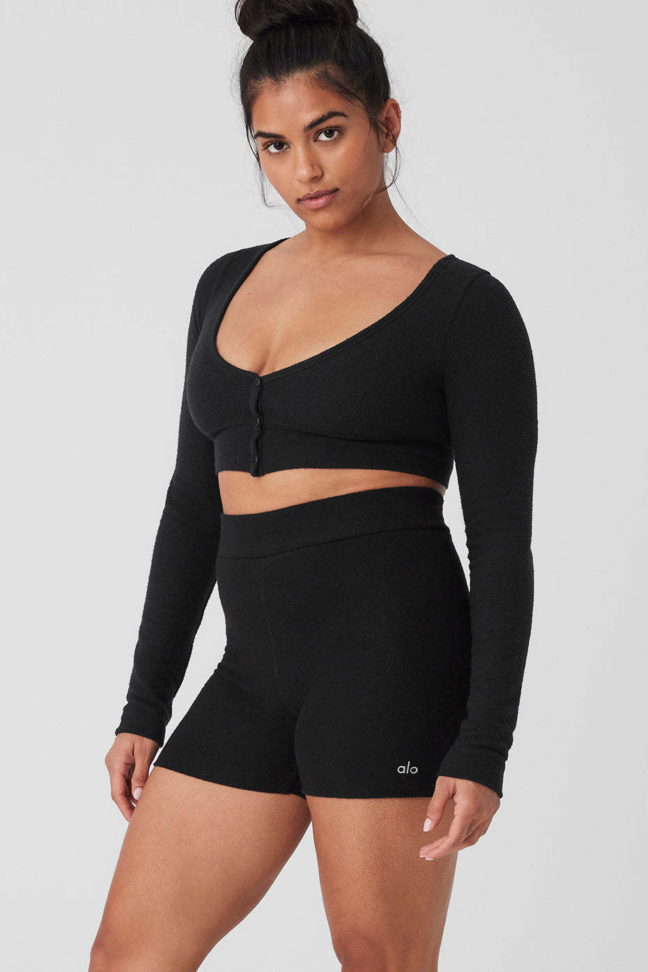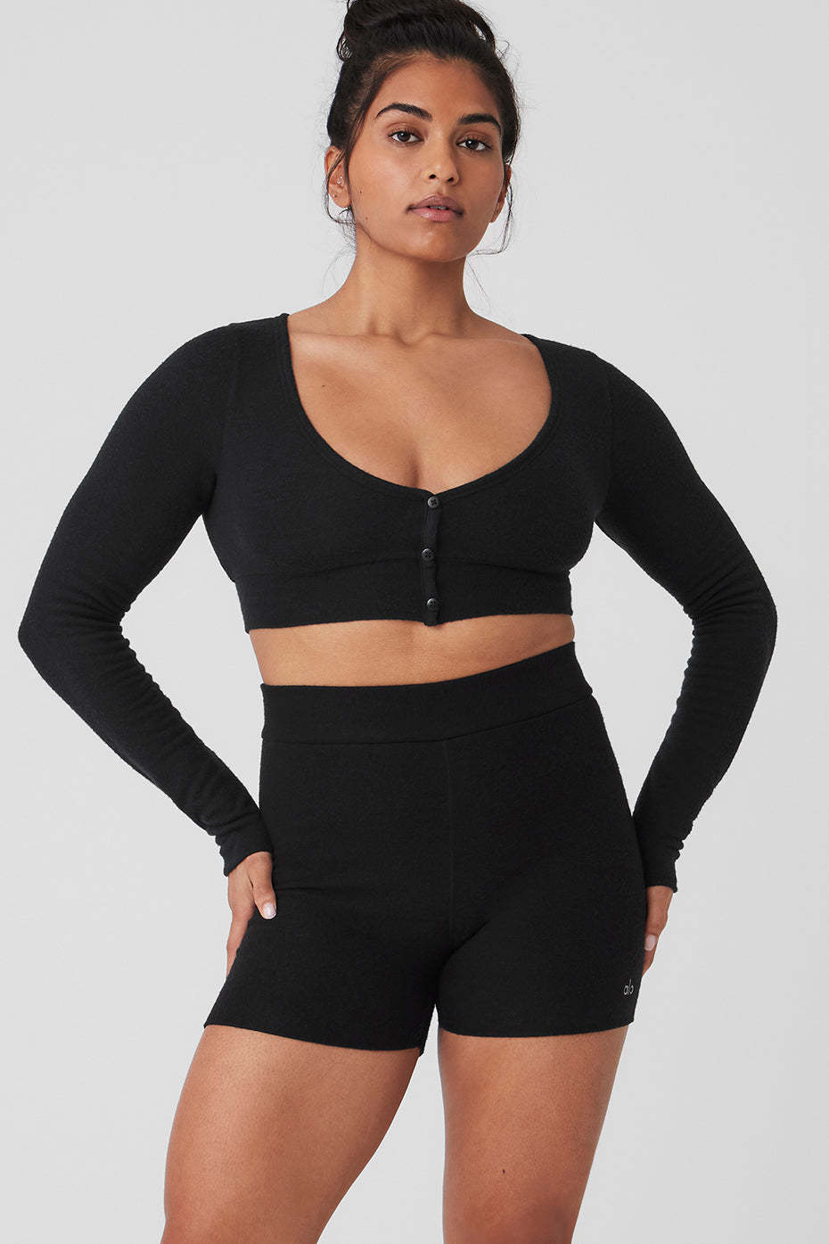 Done in cloud-soft athelolux with a brushed finish that only gets better with time, this cute cropped cardigan turns everyday activites into moments of luxury. And since it*s meant to be worn as a shirt, the buttons dotting down the front are strategically fixed to prevent gapping. Just add the matching shorts, grab a mug of hot cocoa and find the nearest fireplace.