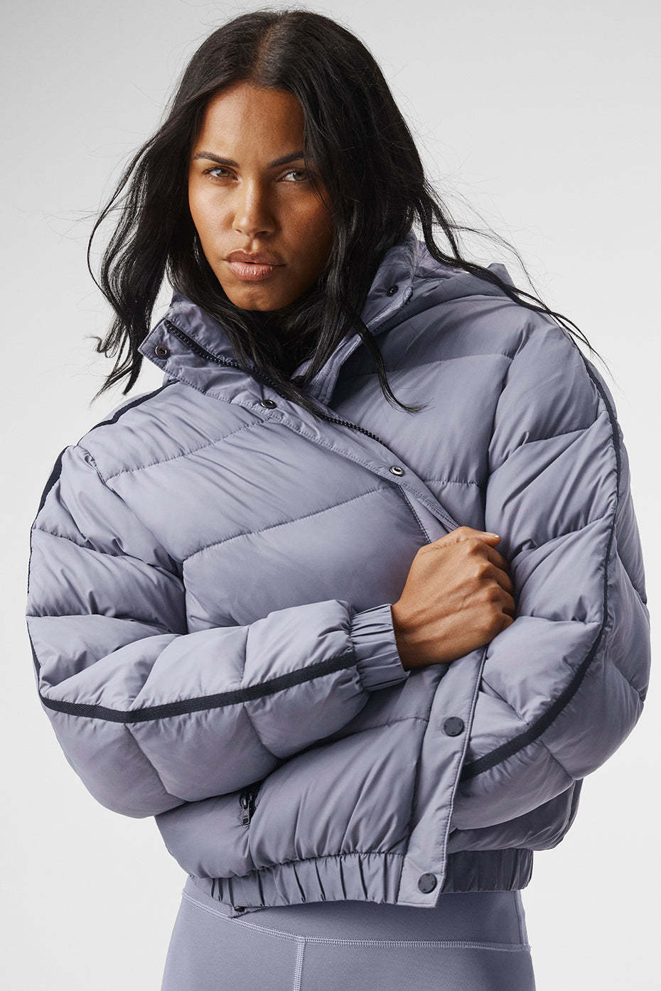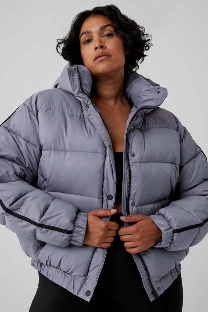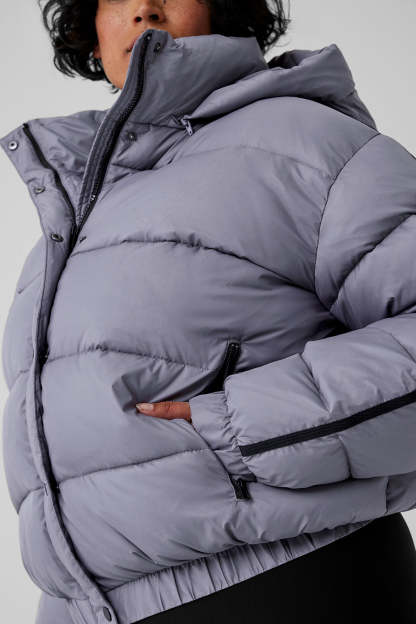 - Regular length puffer jacket hits at the hip