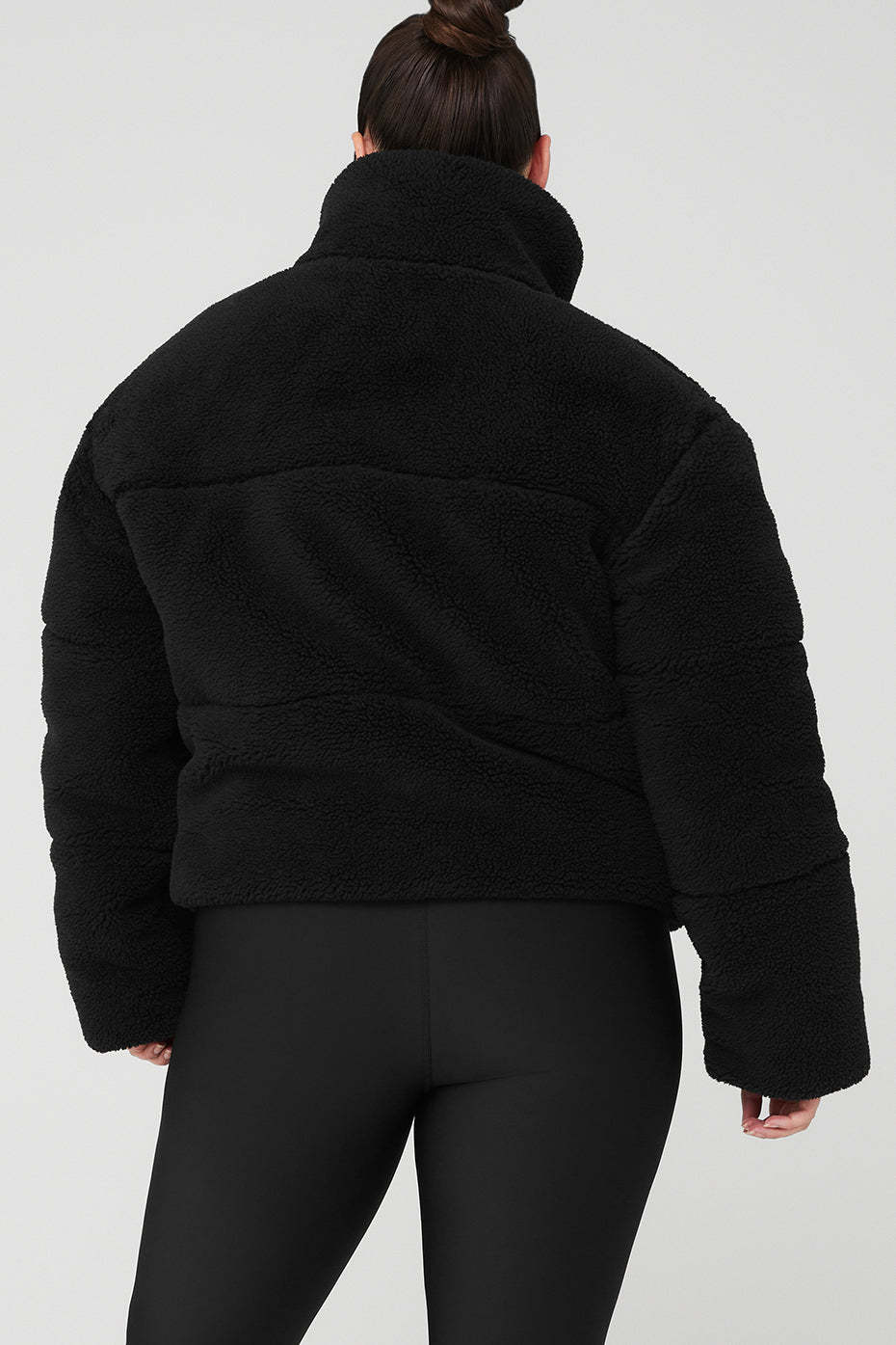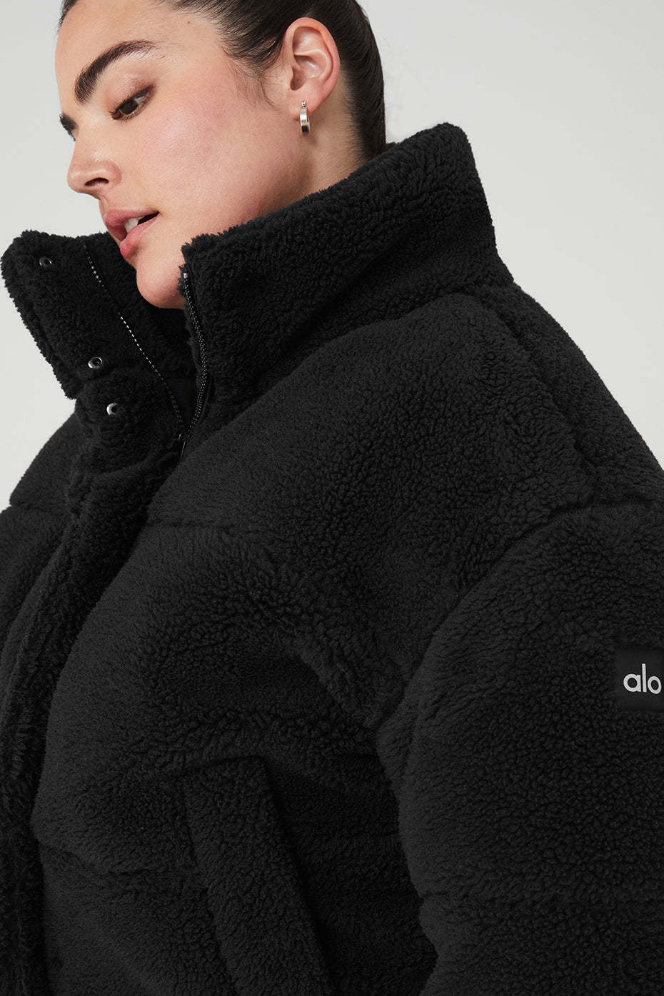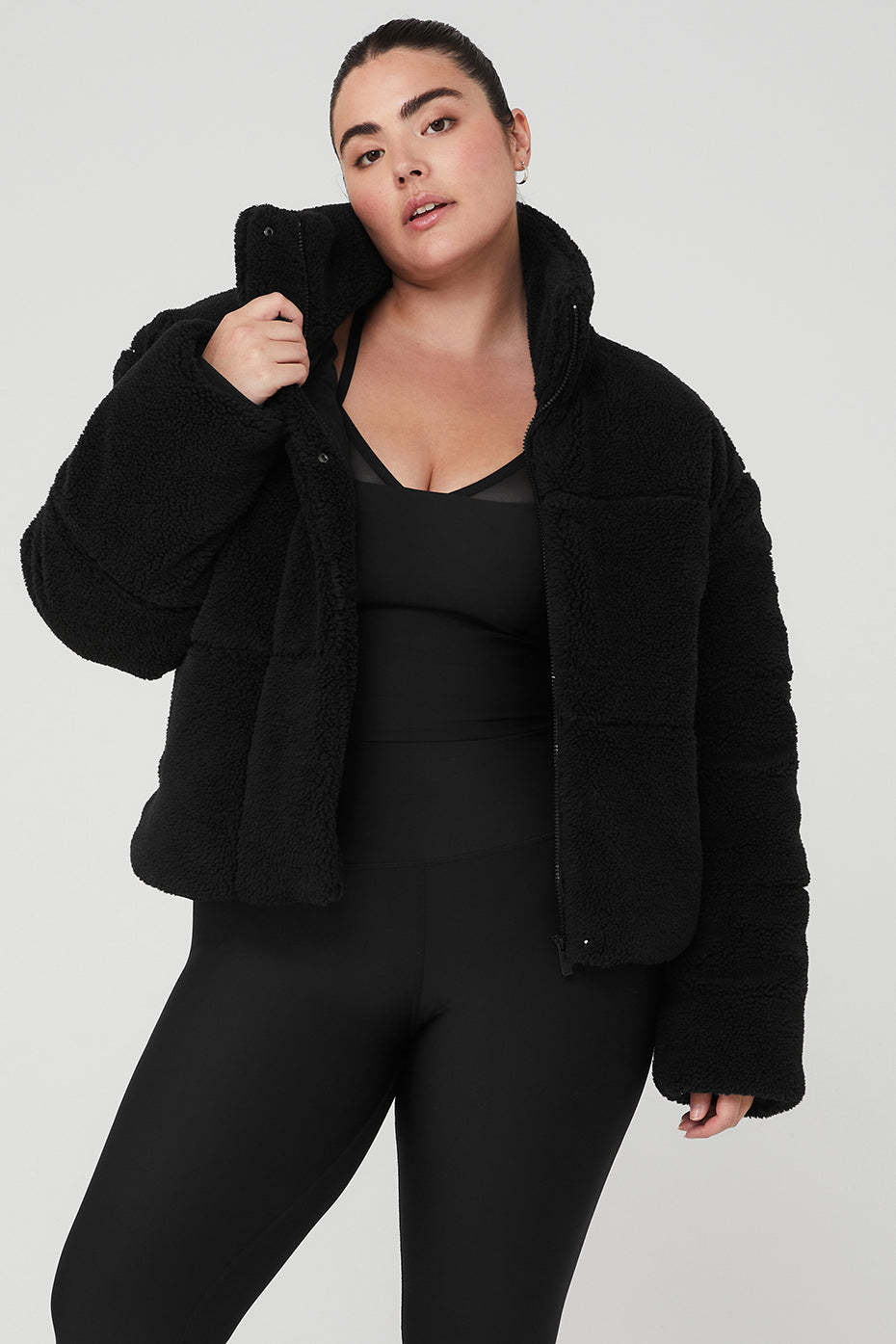 This plush sherpa puffer will keep you warm on morning walks, weekend getaways# Anywhere, really. It has a tall collar, deep zippered pockets and a front zipper with snaps to block the cold. And while the snug, cozy, hip-length fit works well with a matching set underneath, we recommend sizing up if you*d prefer to layer it over something more substantial.